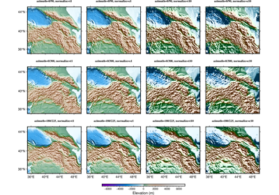 pygmt.Figure.grdimageandpygmt.Figure.grdview. The Lambertian Reflection assumes an ideal surface that reflects all the light that strikes it and the surface appears equally bright from all viewing directions. Here, azim and elev are the azimuth and elevation of the light vector. Optionally, supply ambient [0.55], diffuse [0.6], specular [0.4], or shine [10], which are parameters that control the reflectance properties of the surface. Default values are given in the brackets. Use s for a simpler Lambertian algorithm. Note that with this form you only have to provide azimuth and elevation. Alternatively, use p for the Peucker piecewise linear approximation (simpler but faster algorithm; in this case azim and elev are hardwired to 315 and 45 degrees. This means that even if you provide other values they will be ignored.).[e|t][amp][+aambient][+ssigma][+ooffset]. The actual gradients \(g\) are offset and scaled to produce normalized gradients \(g_n\) with a maximum output magnitude of amp. If amp is not given, default amp = 1. If offset is not given, it is set to the average of \(g\). The following forms are supported: